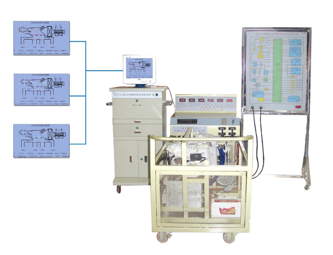 本实验系统选用全套LS400空调系统组件(LS400汽车的进风与空气混合风道总成、冷凝器总成、压缩机、蓄电池、发电机、原车空调ECU等)制作。主要由空调测控实验台、控制电路显示板两大部分组成,其中测控实验台本身就是一台完全独立的测控实验系统,仅选择此一项适合于独立开展高级学员的空调实验教学,通过双通道数据传输线与控制电路显示板连接,可再拓展出初级学员和中级学员两个层次的学习平台。实验台可设置多种典型故障。
