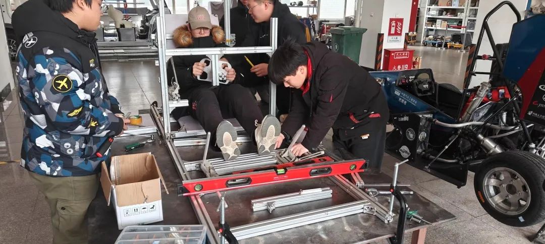 1月16日,队员们继续搭人机台架,在此基础上,通过不断地反复测量、反复定位,来确定座椅和踏板的位置。
