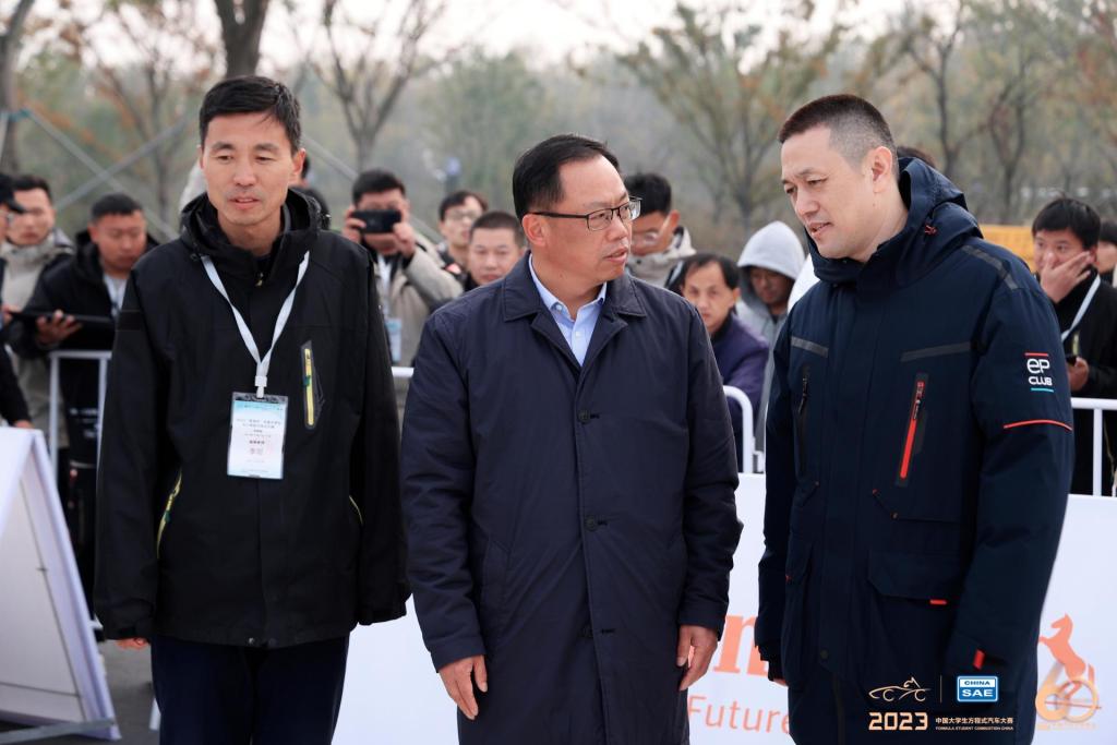 赛事的最后一日,公司党委副书记、董事长王琦亲临比赛现场,为队员们送上关心与鼓励。电车耐久赛完成后,他与队员共同庆祝这激动人心的时刻。他希望队员们在比赛过程中积累经验,与优势车队加强交流学习,相互借鉴。无人车高速循迹比赛中,王琦在场外时刻关注着赛车情况,并与蔚来汽车创始人李斌董事长在校企人才联合培养、新能源与智能网联汽车技术等方面进行了深入交流。